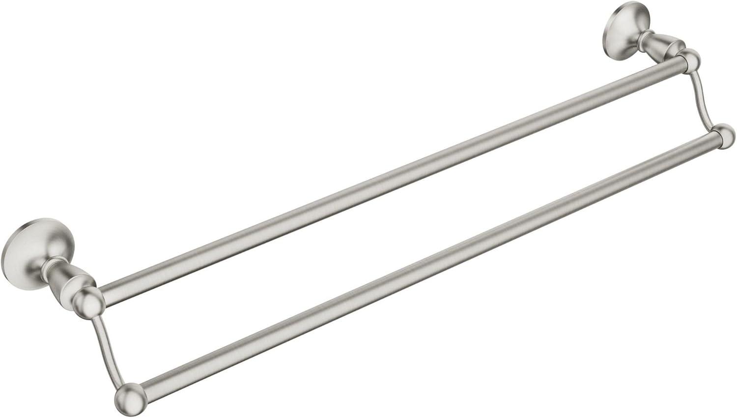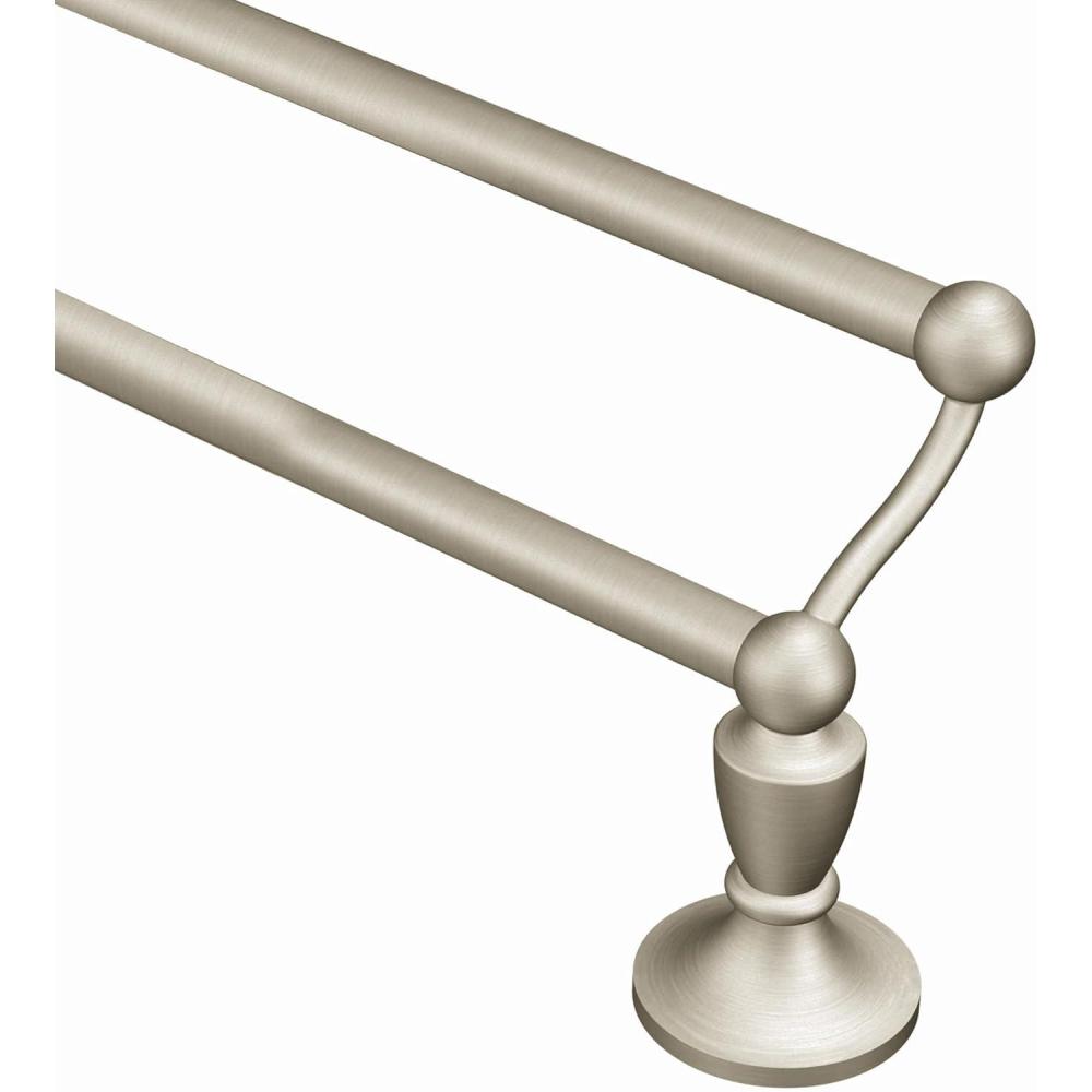 Moen Towel Bar, Double, Round, Series: Wembley, 30 lb Load Capacity, 5/8 in Rod Diameter, Concealed Screw, Wall Mounting, 2.28 in Diameter Mount Flange, 5.57 in Projection, 26.28 in Overall Length, Zinc Bar Post, Brass Bar, Brushed Nickel, Includes: Template and Mounting Hardware, 24 in Rod Length