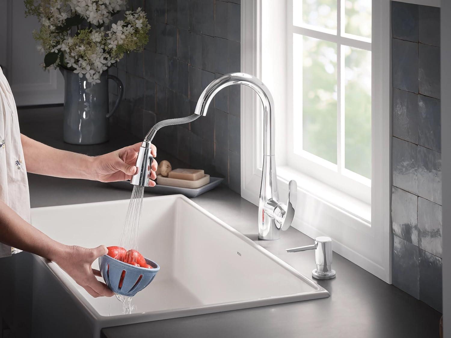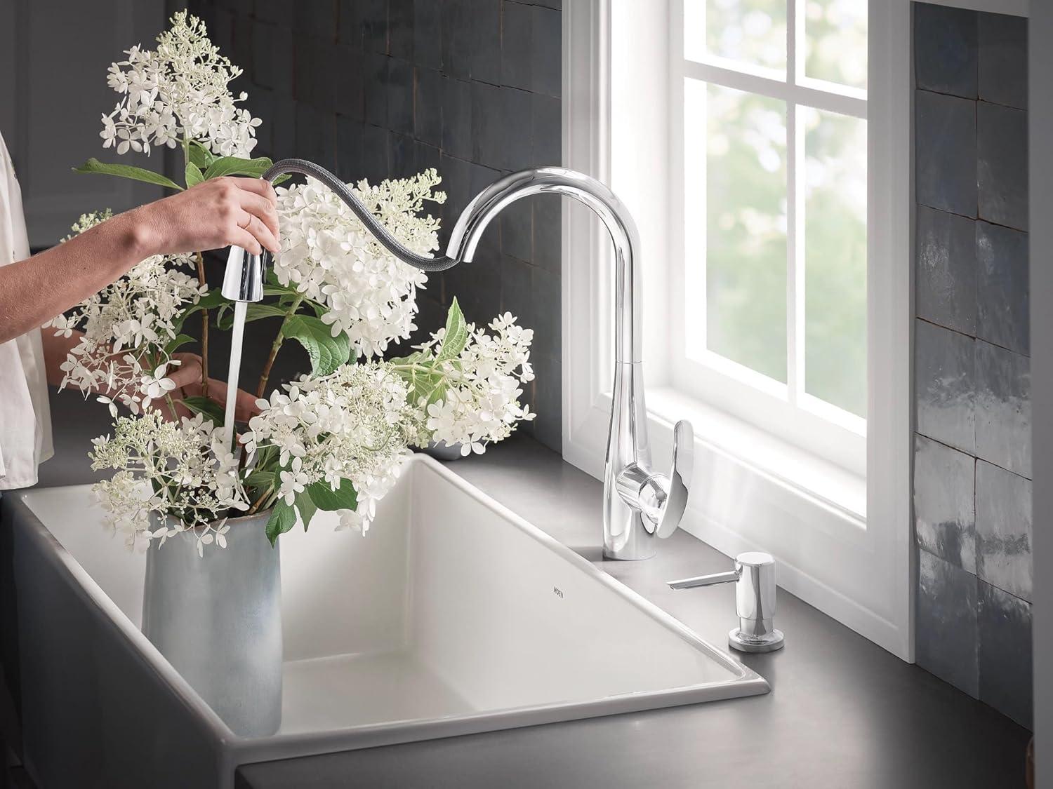 The Moen Reyes Chrome One-Handle High Arc Pulldown Kitchen Faucet with Power Boost is a perfect blend of style, functionality, and innovation for your modern kitchen. The high arc design not only adds a touch of elegance but also provides ample space for washing large pots and pans, making it an ideal choice for busy households. With its single-handle operation, you can effortlessly control water temperature and flow, ensuring a seamless and efficient kitchen experience. The Moen Reyes kitchen sink faucet with sprayer is equipped with a state-of-the-art pull down spray head, featuring Moen’s exclusive Power Boost technology. This innovative feature delivers a faster clean and faster fill with the push of a button, making everyday tasks more efficient. Whether you’re rinsing vegetables, filling pots, or cleaning the sink, the pull-down sprayer offers maximum flexibility and reach, allowing you to tackle any kitchen task with ease. The faucet’s smooth retraction system ensures the spray head returns securely to its docked position. It comes with a soap dispenser.