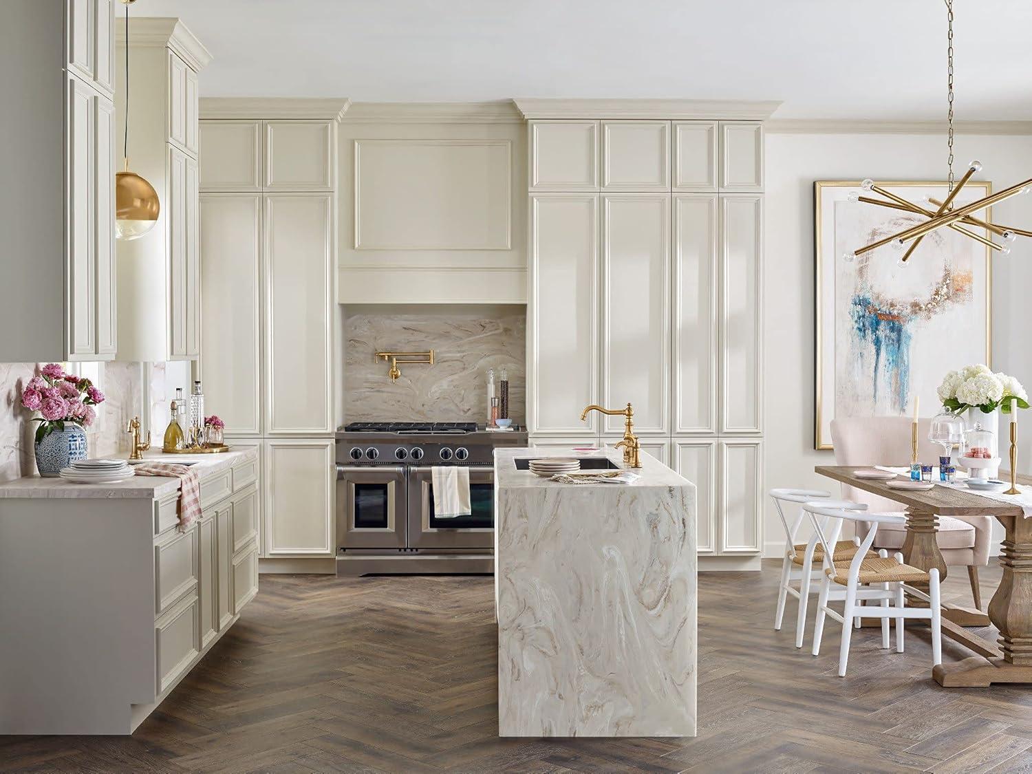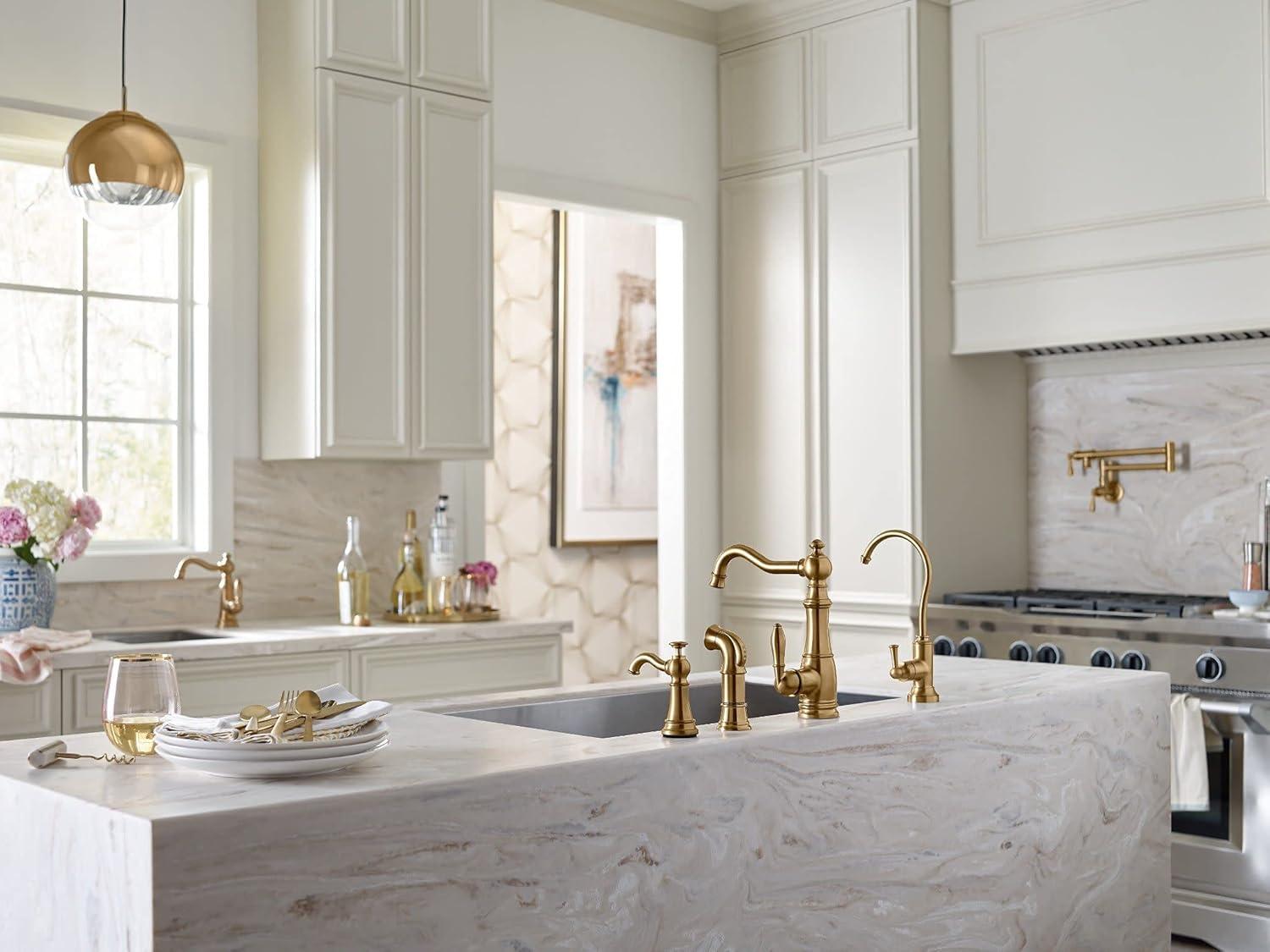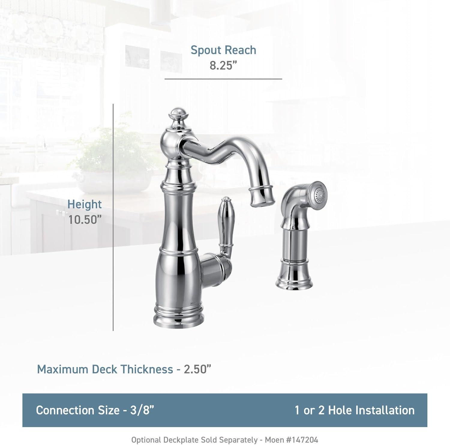 Elegant, traditional design details and distinctive finishing touches present a sense of uncommon luxury in the Weymouth collection from Moen. Accents on the Weymouth Single-Handle Kitchen Faucet include porcelain inlays that feature Euro-influenced decorative script to create a vintage, eye-catching statement in your kitchen. Joining classic appeal with modern functionality, this unique fixture comes complete with a coordinating side sprayer.